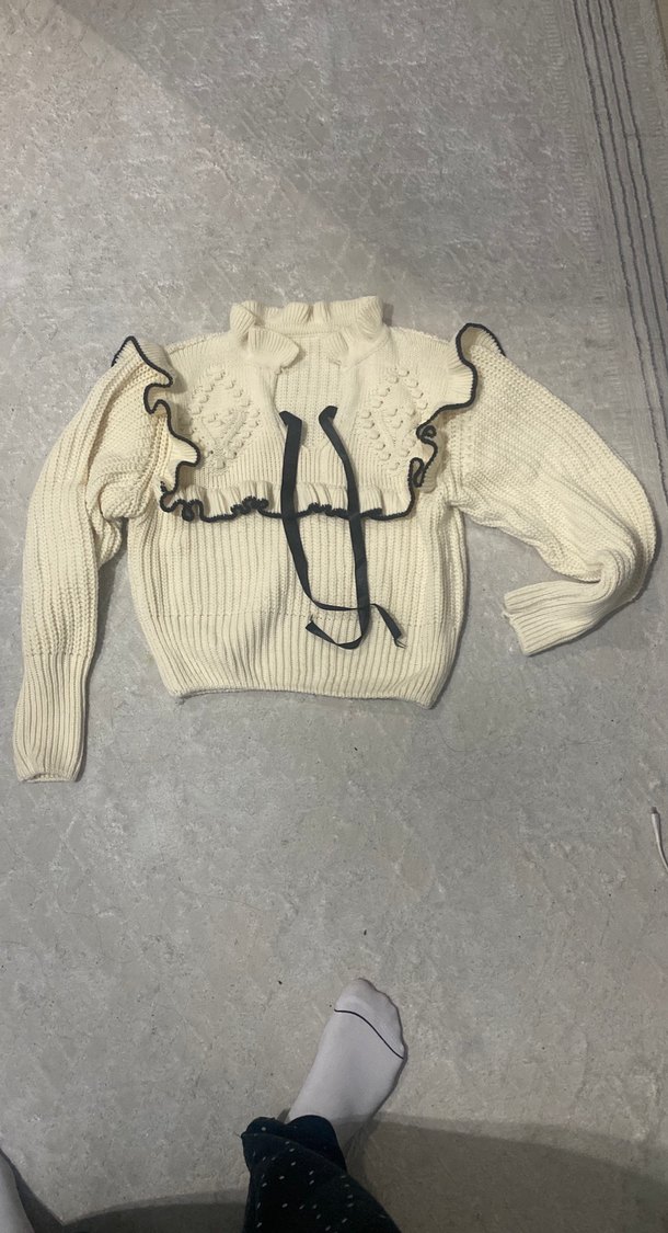 Beyaz renkli, yüksek yakalı, uzun kollu kadın triko kazak. Nakışlı ve fırfırlı detaylarıyla rahat, sokak modasına uygun kesim sunar.
