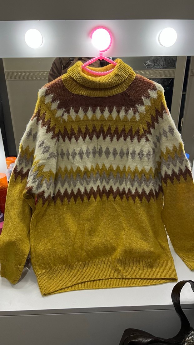 Hiçbir sorunu yok tertemiz Bohem tarzda, yüksek yakalı Örgü, rahat kumaştan, bol kesimdir 42 44 bedene kadar rahat rahat olur