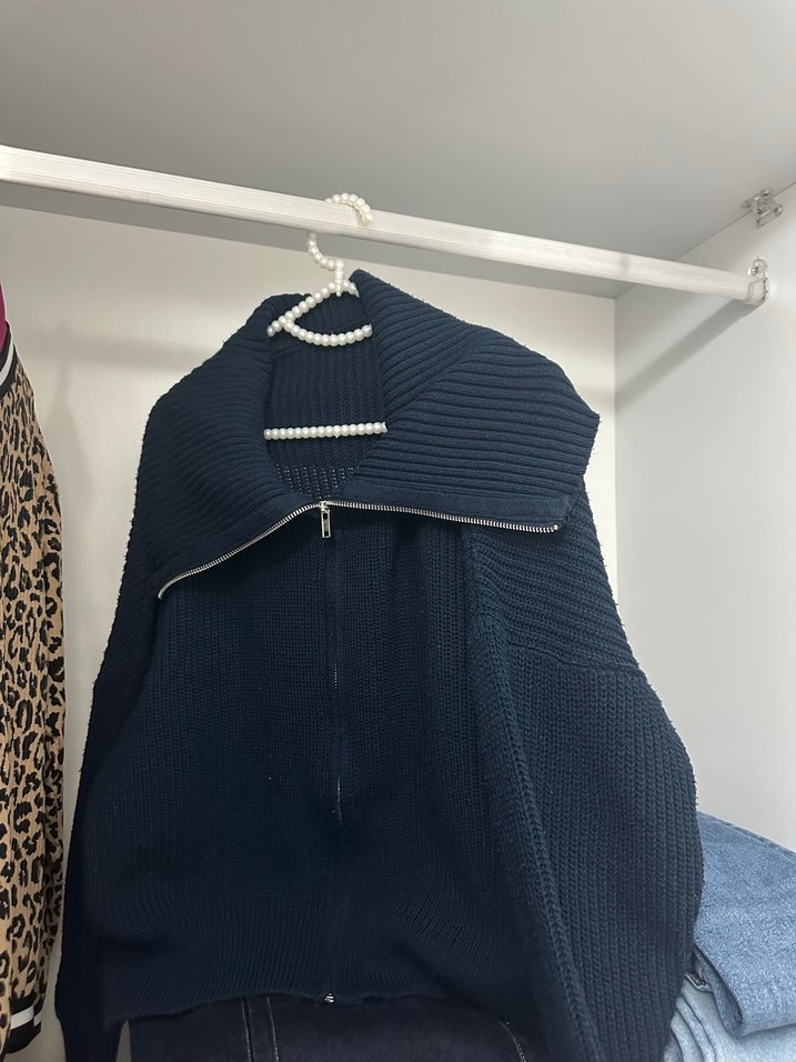 Fitted kesim, koyu gri renkli örgü triko, yüksek yakalı ve uzun kolludur. Rahat sokak stili ve midi boy uzunluğundadır.