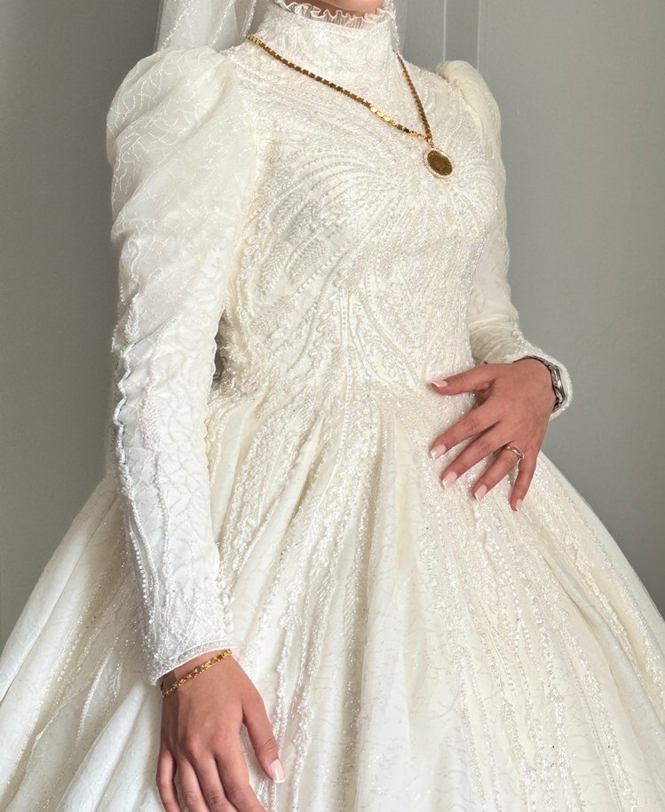 Yüksek Yakalı Parlak Beyaz Prenses Gelinlik