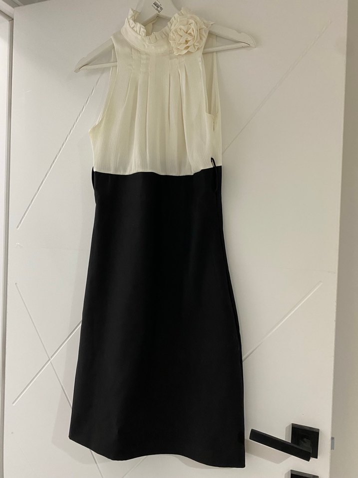 Yüksek yakalı, pilili ve çiçek detaylı kolsuz midi elbise. Beyaz ve siyah renklerle modern klasik tarzda, az kullanılmıştır