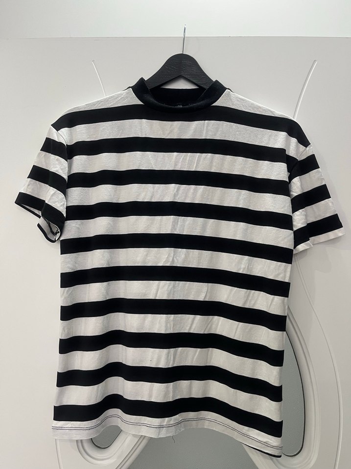 Yüksek Yakalı Siyah Beyaz Çizgili Tişört