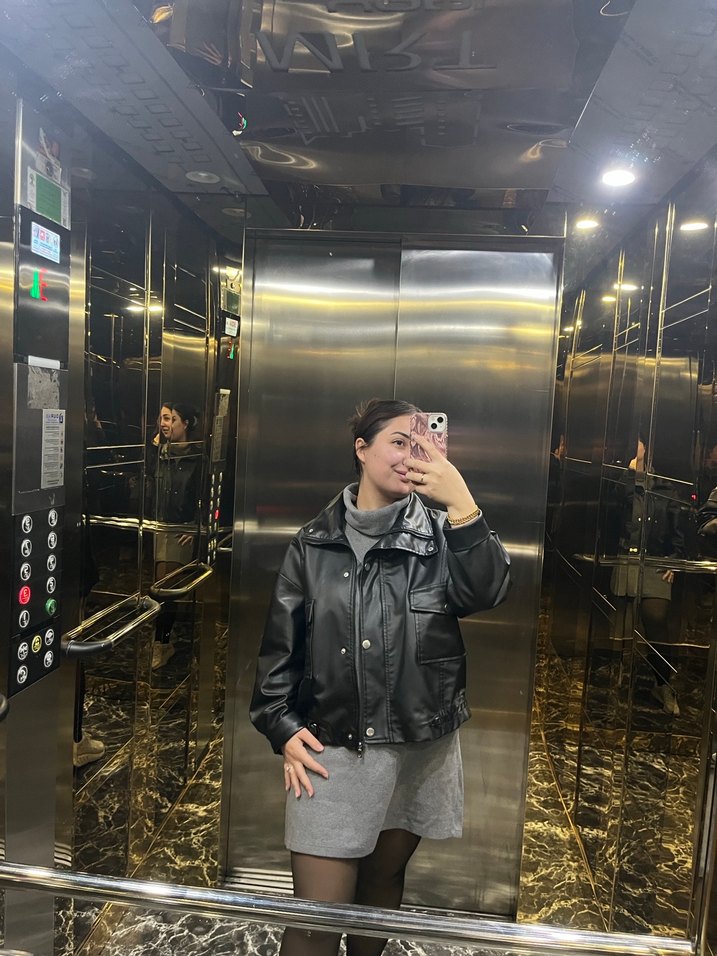 Siyah deri ceket, bol kesim ve yüksek yakaya sahiptir. Şeffaf detaylar ve uzun kollu tasarımıyla sokak modasına uygun, günlük kullanıma ideal.