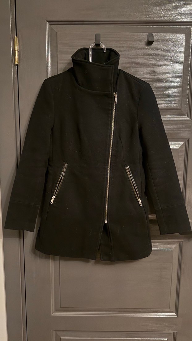 Yüksek yakalı, asimetrik fermuarlı siyah kaban. Ön kısmında iki fermuarlı cep bulunur. Yumuşak ve sıcak kumaştan üretilmiştir.