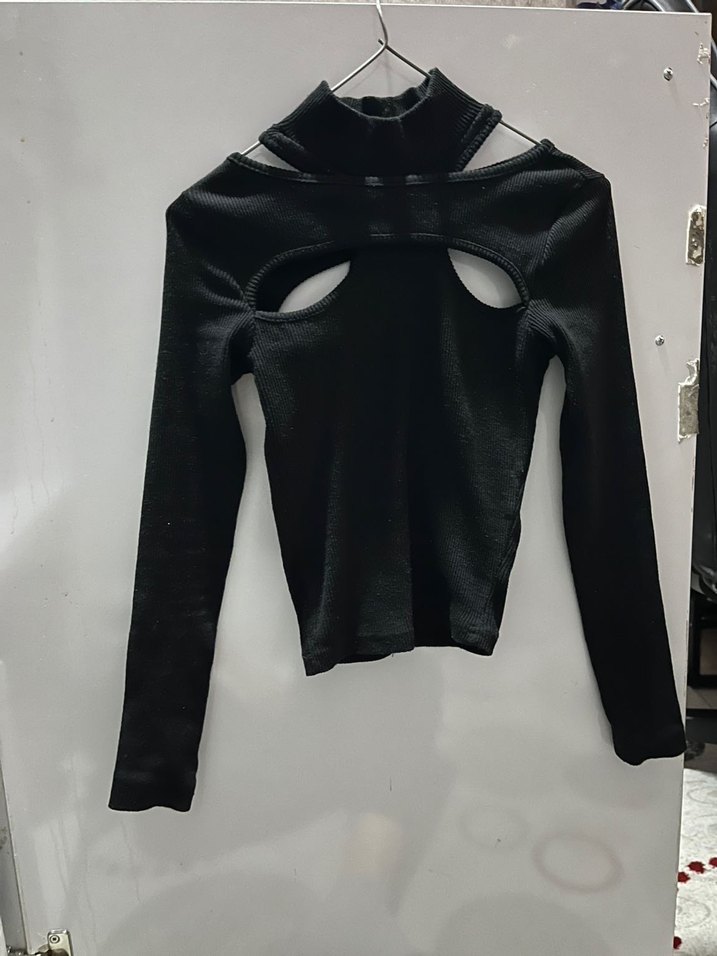 Yüksek yakalı, uzun kollu ve göğüs kısmında yırtmaç detaylı siyah, dar kesim gotik kadın kazağı. Orta uzunlukta ve düz sentetik kumaştan.