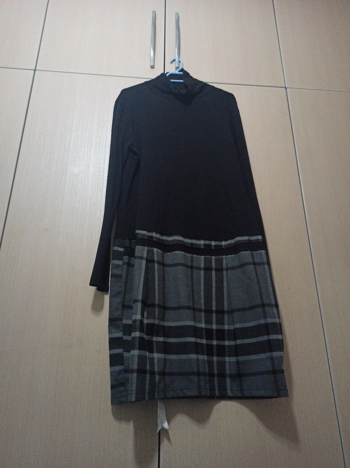 Yüksek yakalı, uzun kollu ve bol kesim midi triko elbise. Alt kısmı gri ekose desenli, üst kısmı siyah, drapeli ve minimal tarzda.