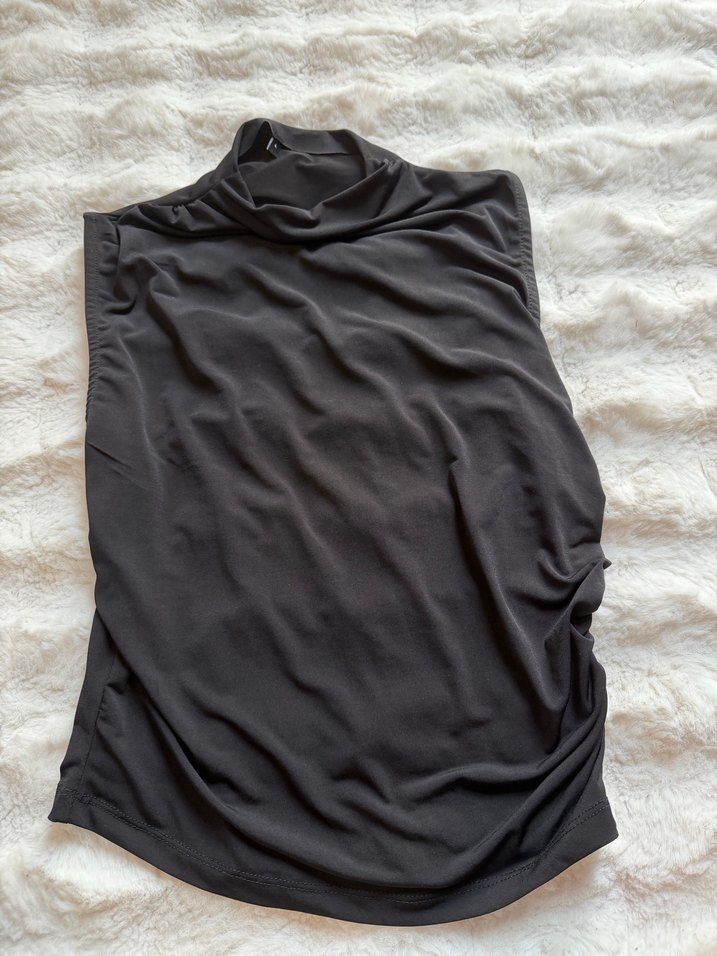 Yüksek yakalı ve drapeli siyah hamile atlet, sentetik yumuşak kumaştan. Normal boyda, sokak modasına uygun şık ve rahat bir parça.