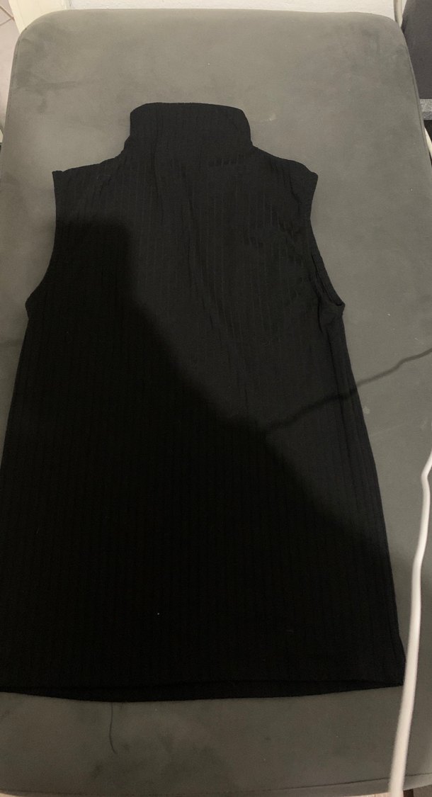 Yüksek yakalı, kolsuz, siyah, pilili sentetik kumaştan yapılmış, gövdeyi saran kesimde midi uzunlukta kadın yelek.