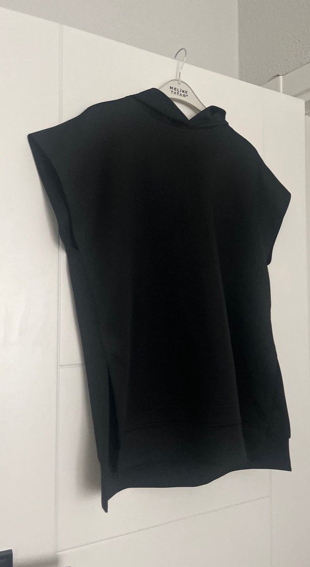 Yüksek yakalı, kolsuz ve bol kesim kadın yeleği, yumuşak sentetik kumaştan yapılmıştır. Koyu siyah renk ve midi boyuyla günlük kullanıma uygundur. Scuba kumaş Sıyah kapşonlu