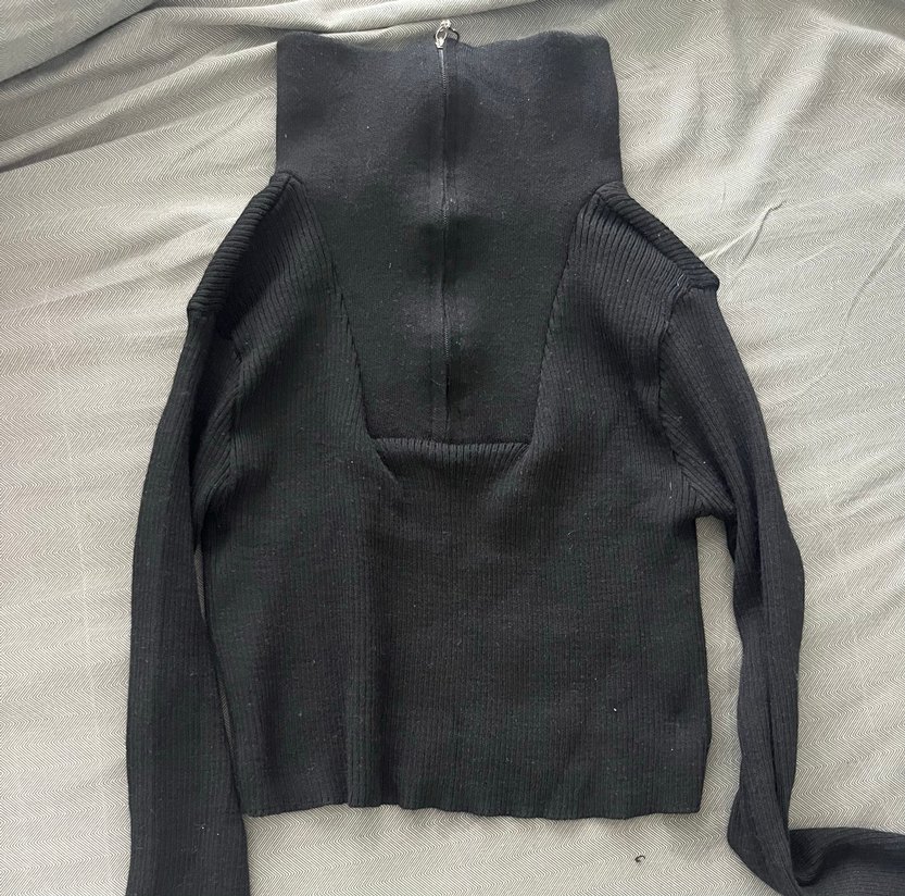 Siyah örgü kadın kazak, yüksek yaka ve vücuda oturan uzun kolludur. Yün malzemeden yapılmış, normal midi boyunda, desensiz ve şık gotik tarzda.
