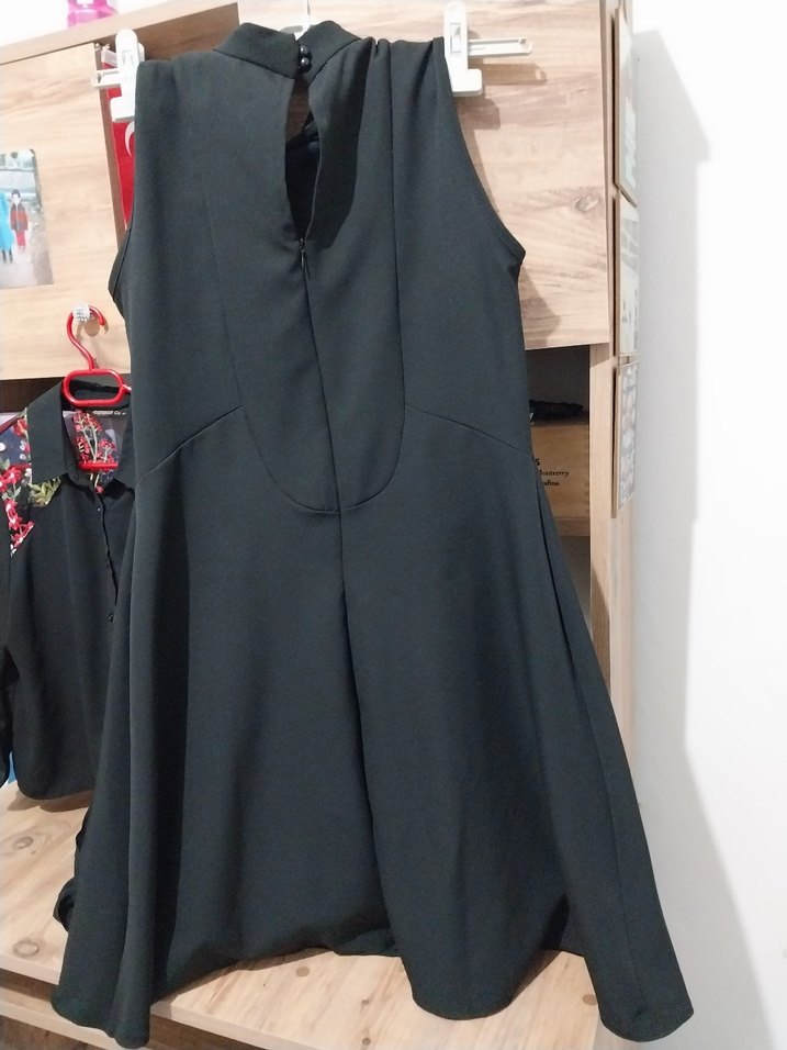 Yüksek yakalı, kolsuz, dökümlü ve salaş kesim siyah midi elbise. Gotik tarzıyla günlük kullanıma uygun avant-garde bir model.
