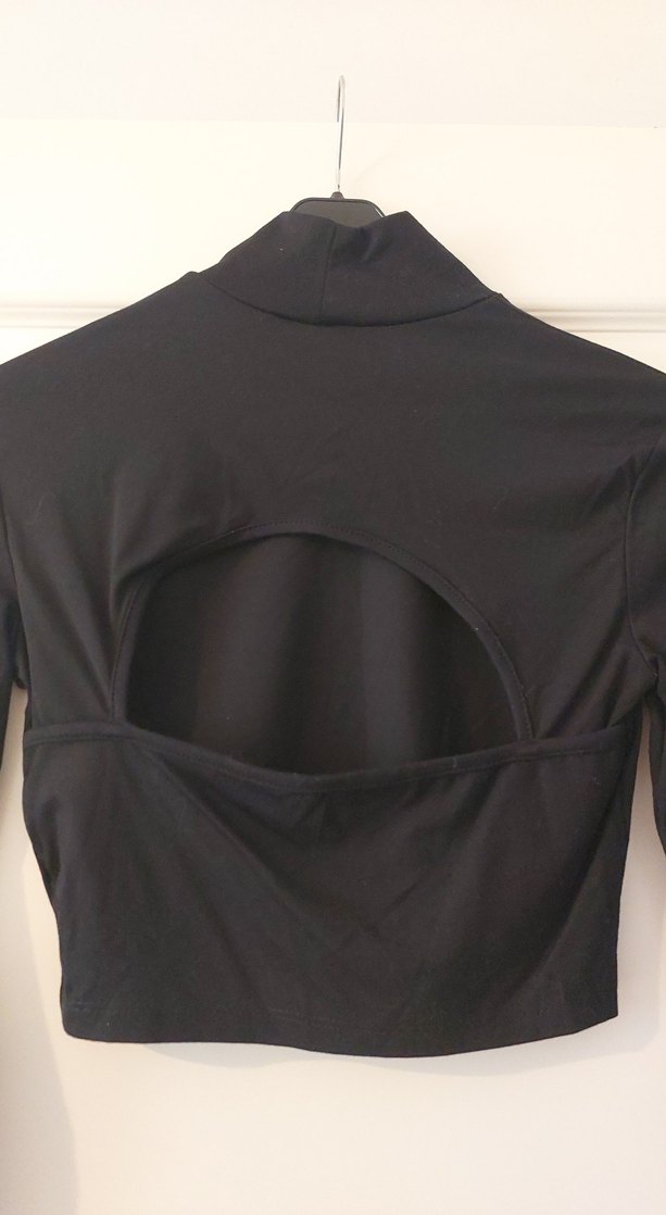 Yüksek yakalı, uzun kollu ve vücuda oturan bu kadın bluz, düz siyah sentetik kumaştan yapılmıştır. Midi boyda ve sırtında kesik detayıyla spor ve gotik tarzı bir görünüm sunar.
