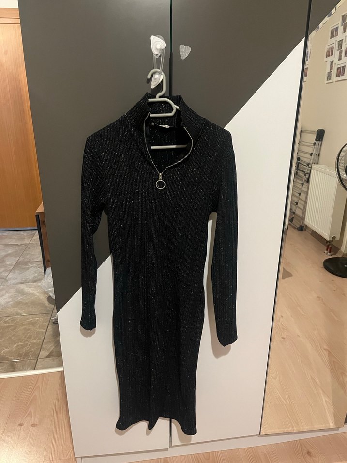 Yüksek yakalı, uzun kollu ve örme dokulu renkli hafif parıltılı elbise