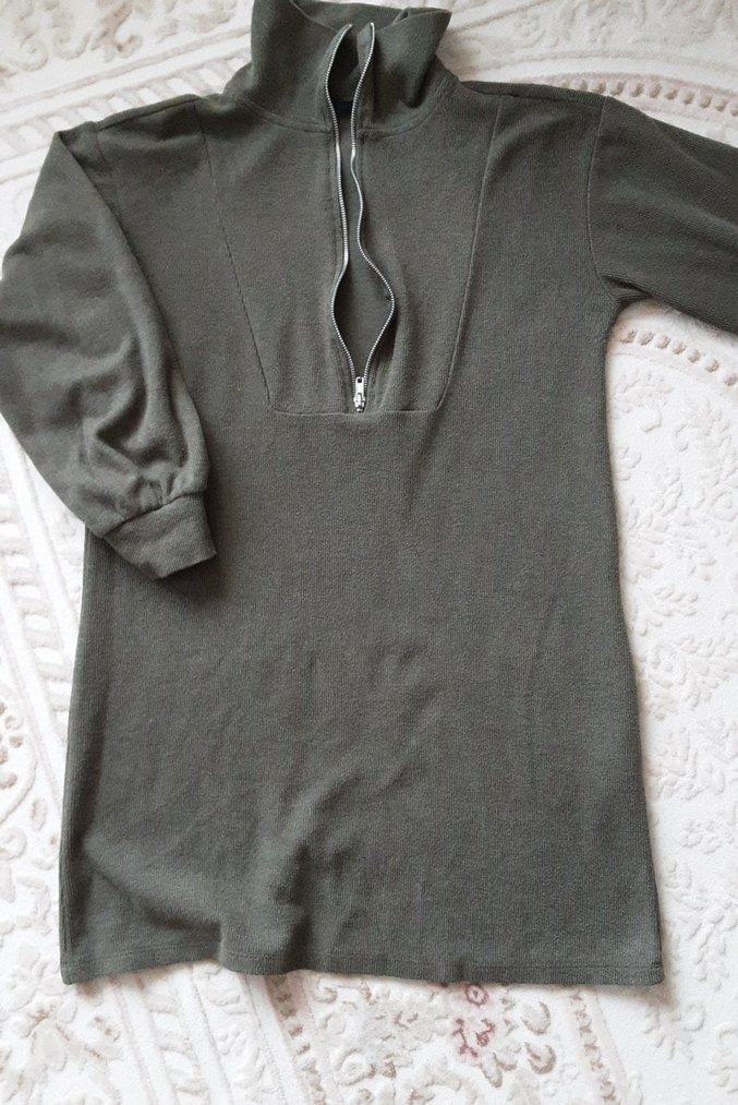 yeşil renkte, yüksek yakalı ve uzun kollu, fermuarlı tunik. Yumuşak keten kumaştan, günlük kullanım için uygundur.