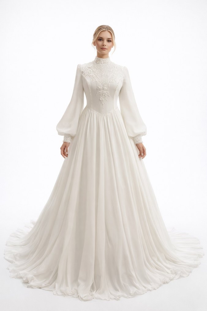 Yüksek Yakalı Uzun Kollu A Kesim Beyaz Gelinlik