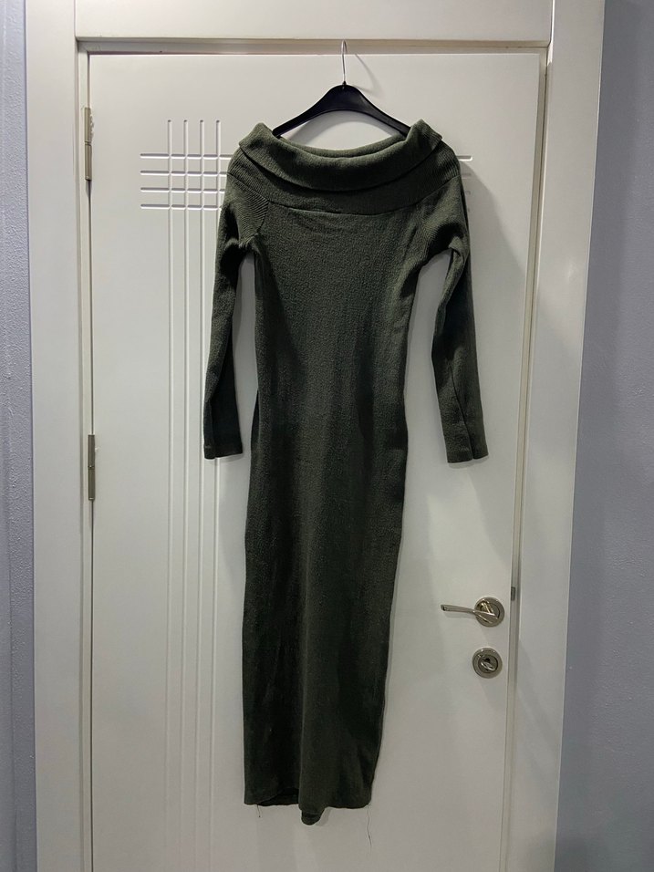 Yumuşak triko sentetik kumaştan üretilmiş, yüksek yakalı ve uzun kollu, vücuda oturan uzun gri elbisedir. Günlük sokak stili için uygundur.