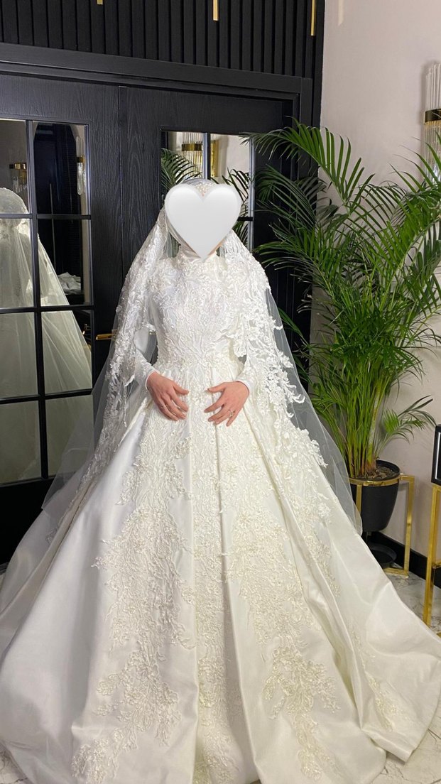Yüksek yakalı ve uzun kollu, işlemeli dantel detaylara sahip ince kesim prenses gelinlik. Modest ve gotik tarzda, düğünler için uygun beyaz renkli. Duvak ve tarlaran içinde. Kuru temizleme yapılmadı. Ablamın gelinliği tekliflere açığız :)