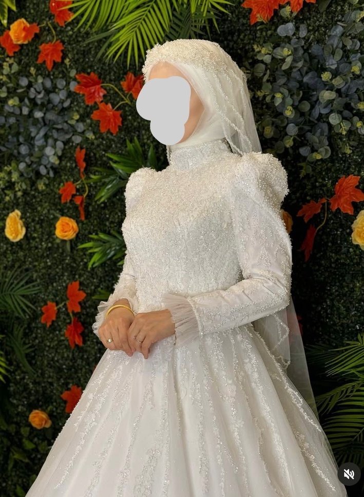 Gelinlik sade şıklık arayanlar için özel dikilmiştir. Üst bedeni lazer kesim ufak çiçeklerle ve boncuk işlemesiyle tül eteklerine dökülmektedir. Bileklerinde etekle uyumlu olacak şekilde tül detaylarıyla zarif bir bütünlük yakalanmıştır. Tamamen işlemeli ve sadece kenarları işlemeli olmak üzere iki duvak, baş yapımı için kullanılmamış beyaz bone, tül ve penye parça hediyedir