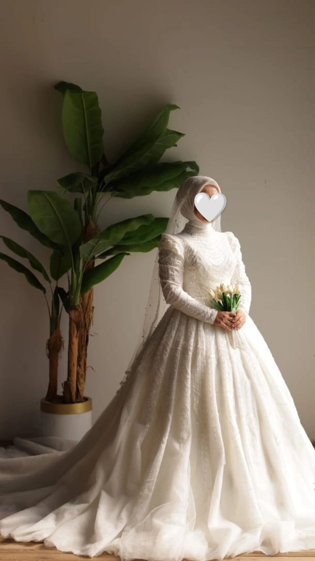 Uzun kollu, yüksek yakalı ve vintage tarzda, beyaz renkli, vücuda oturan prenses kesim gelinlik. bir kere giyildi temiz yanında duvak hediye olacak