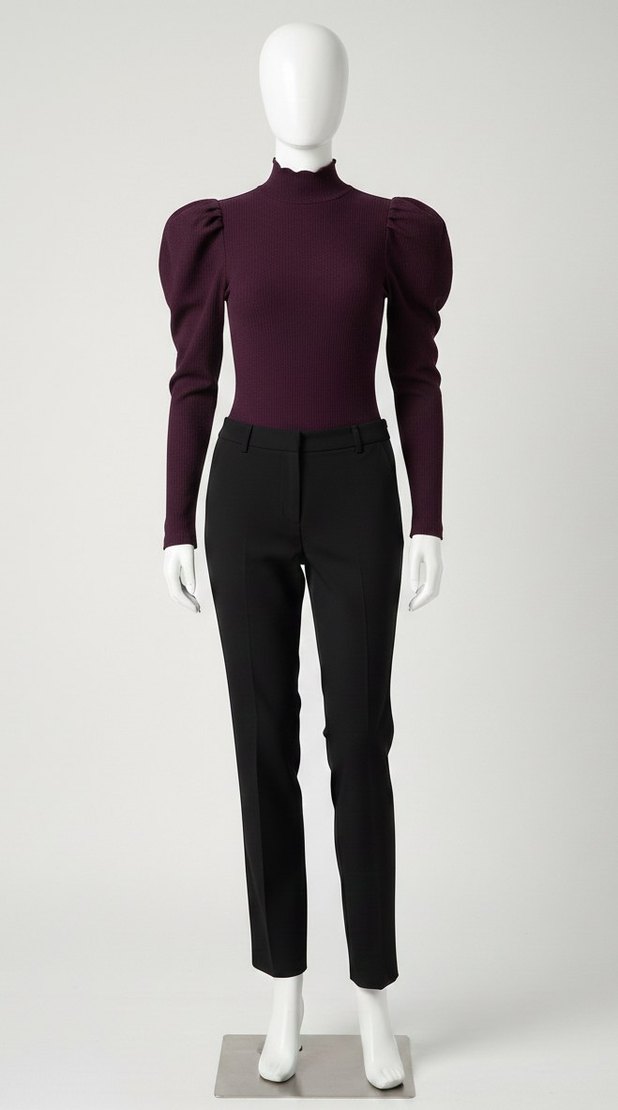 Kadınlar için yüksek yakalı, uzun kabarık kollu yün triko. Normal kesim ve midi boyda, modern ofis şıklığı sağlar. Desensiz, zahmetsiz şıklık sunar. 1 2 kere giyildi