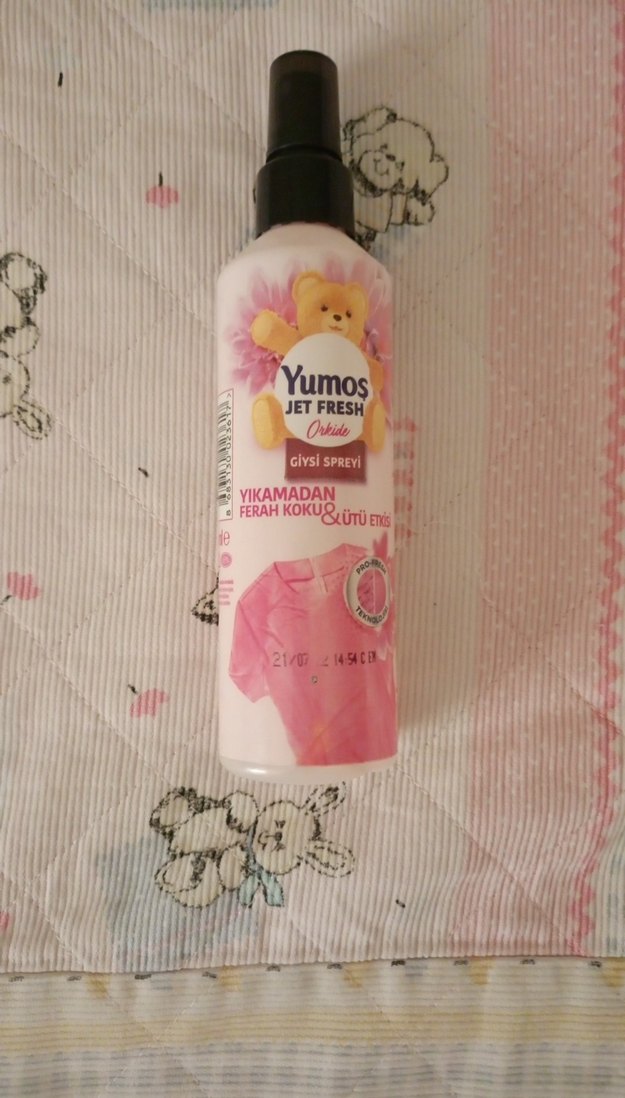 Yumoş Jet Fresh Orkide giysi spreyi, yıkamadan ferah koku ve ütü kolaylığı sağlar. Kıyafetlerin hızlıca tazelenmesi için uygundur. parmagımın olduğu yere kadar dolu son resim