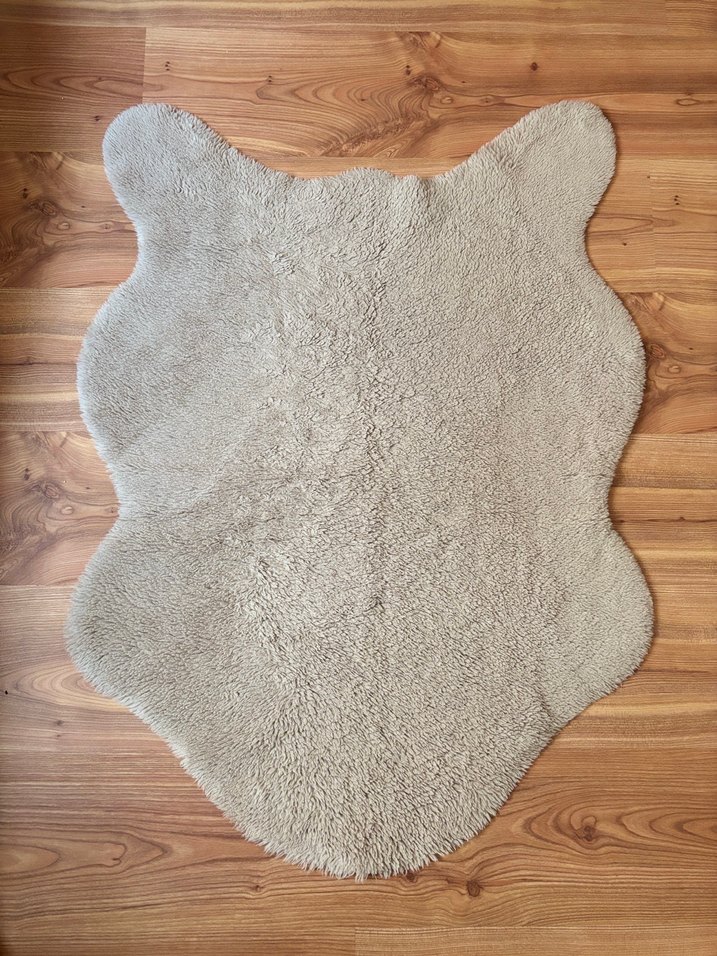 Peluş bej renk halı sorunu yoktur ölçüleri uzunluk 90 - 95 cm arası eni 67 cm şekilli kesim olduğundan ölçüler değişiklik gösterebilir.