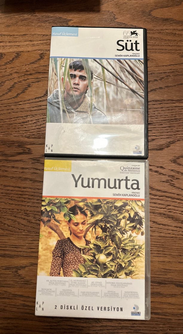 Semih Kaplanoğlu'nun 'Yumurta' ve 'Süt' filmlerinin DVD seti, orijinal kapaklarıyla birlikte.