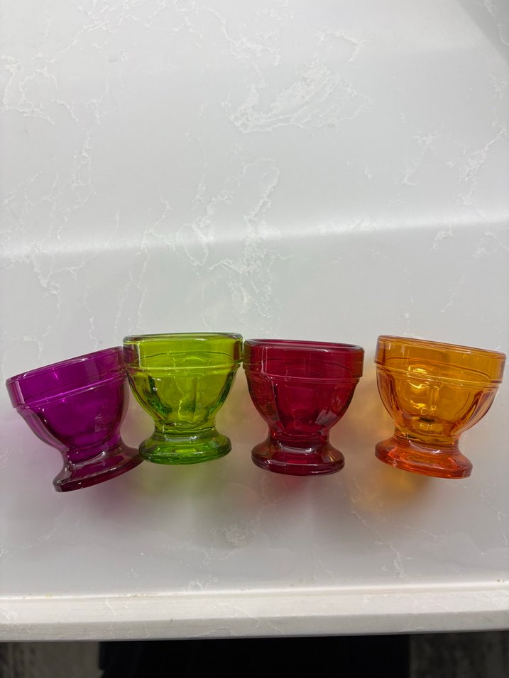Mor, yeşil, kırmızı ve turuncu renklerde sağlam tabanlı renkli cam. Masanıza canlılık katacak parlak renkler içerir. Sapasağlam hiç kullanılmadı yumurtalık diye almıştım kahve yanı da kullanılır