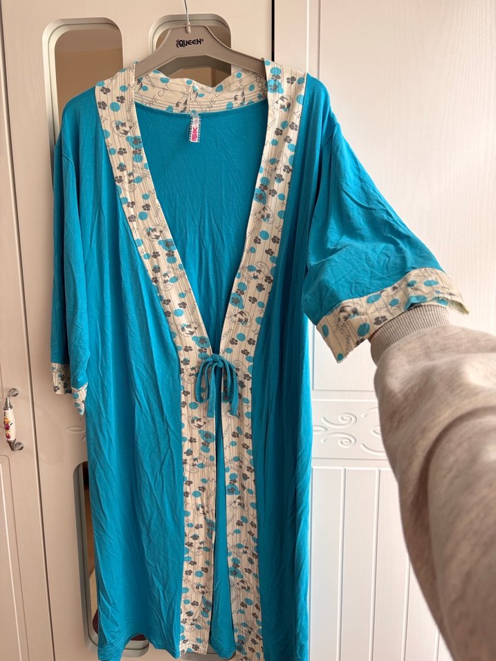Uzun turkuaz sabahlık, bol kesim ve uzun kolludur. Bohem tarzda, bağcıklı ve çiçek desenli süslemelere sahiptir. Etiketsiz sıfır
