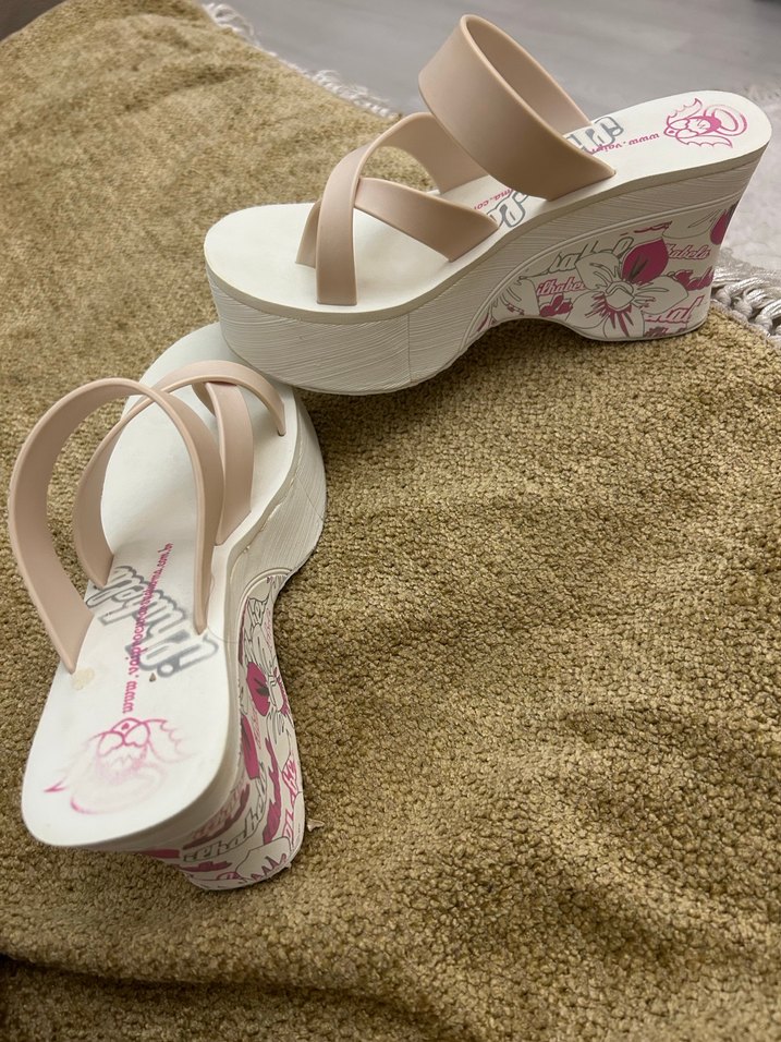 Pembe baskılı desenli, kauçuk malzemeden yapılmış dolgu topuklu terlik. Bohem tarz ve düğünler için uygun.