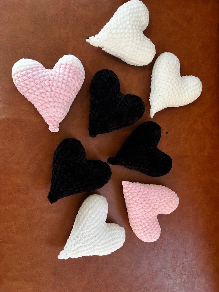 Siyah, beyaz ve pembe renklerde yumuşak dokulu kalp şeklinde dekoratif yastıklar. Bohem tarzı için uygun. 15 cm kadife örgü kalp (adet fiyatıdır) #amigurumi #kalp #örgü #oyuncak #dekorasyon #hediyelik