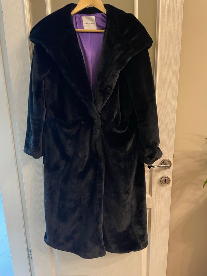 Mor astarlı , kapüşonlu maksi boy, yumuşak kumaştan yapılmış kadın kaban. Şal yakaya ve bol kesime sahiptir, Çıtçıt ile ön kapama yapılmaktadır. Polyester üründür