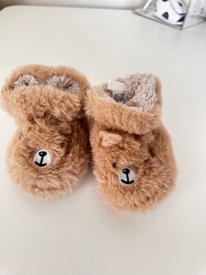 Kahverengi, yumuşak kürklü ve nakışlı ayıcık detaylı çocuk ev terliği. Konforlu, sıcak tutan peluş kumaştan üretilmiştir. 21 numara yazıyor ama kızıma dar geldi 19 numara ile aynı taban ölçüleri o yüzden 19 numaradır