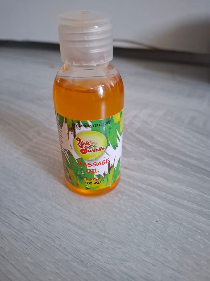 100 ml'lik küçük şişede, yeşil yaprak desenli renkli etiketli yumuşak masaj yağı. Rahatlatıcı masaj için uygundur. Kavun kokuludur