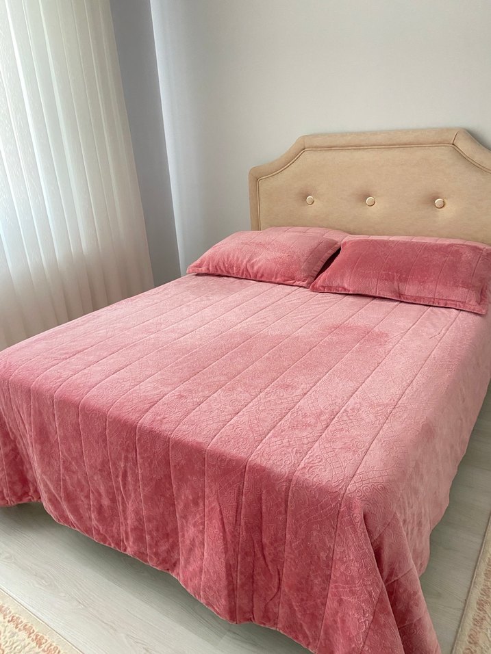 Pastel pembe renkte, yumuşak dokulu ve desensiz yatak örtüsü, yatak odasına sıcaklık katıyor ️.