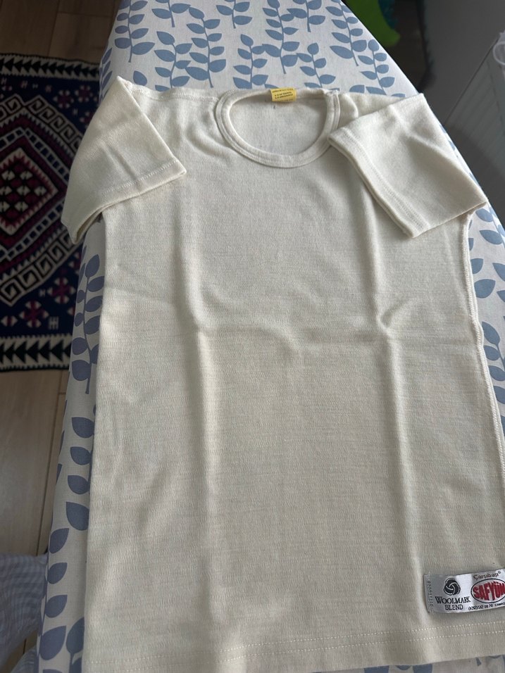 Hiç kullanılmamıştır. Saf yündür. Ense kısmında ufak bir atma var ama kolayca tutturulabilir. 8 yaş atlet içlik Beyaz çocuk içlik, kısa kollu ve yumuşak, rahat kumaştan üretilmiştir. Yuvarlak yakalı ve etek ucunda küçük bir etiket detayı vardır.