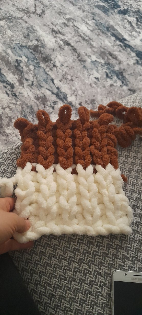 Yumuşak yünden örülmüş, kahverengi ve beyaz renklerde kalın örgü çocuk battaniyesi. Sıcaklık ve konfor sağlar. 90 90 veya 100 100 ebadında model yeni