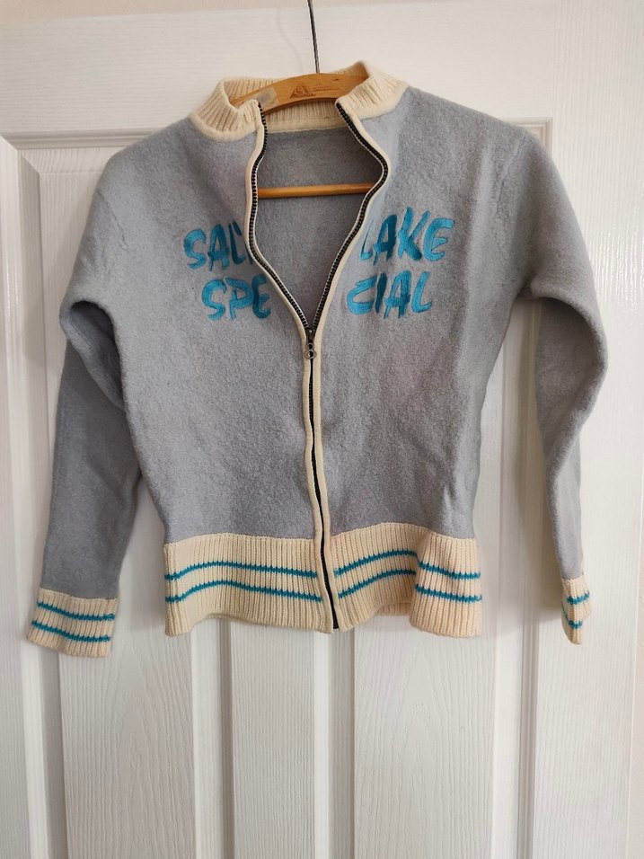 Fitilli, gri yün örgü hırka, uzun kollu ve fermuarlı. Önünde mavi yazılar ve çizgili ribana manşet ve etek ucu bulunur. mavi Jean vintage S beden