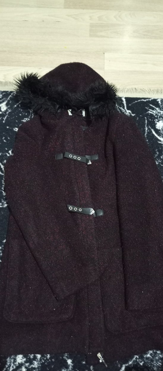 Bu bordo uzun yün kaban, kapüşonunda kürk detayları ve notalı yaka ile bol kesimdir. Günlük kullanım için uygundur.
