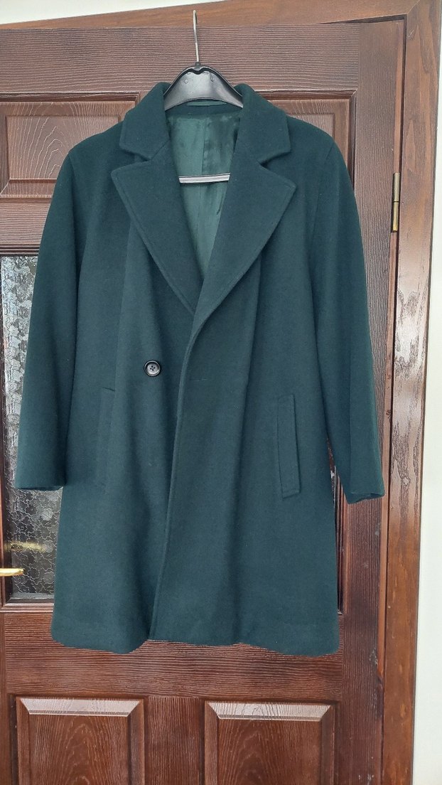 Koyu yeşil renkli, düğmeli, diz boyu kadın kaban. Notlu yaka ve uzun kollu, rahat kesim, yumuşak ve sıcak kumaştan, ofis için uygun.