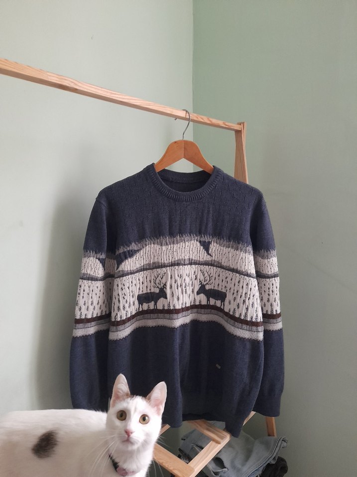 yün kazak. Yuvarlak yaka ve uzun kollu, bol kesim rahat bir tasarıma sahip. Günlük kullanıma uygun, sade ve rahat bir model.