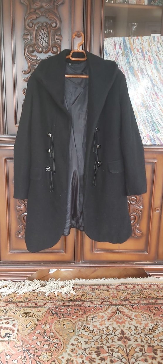 Düğmeli detaylara ve astarlı iç yapıya sahip siyah kadın kabanı, iki ön cepli klasik ve kullanışlı tasarım sunar. %30 yundur