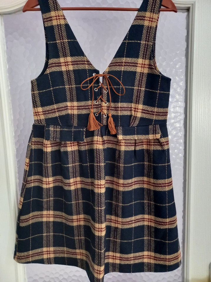 #salopet#kısaelbise#günlükelbise Ürün kızıma ait hiç kullanılmadı ,giyemeden zayıfladı satışa koydum..Yeri ince kaşe, yünlü kumaş.. Sıcak ve yumuşak.. Önde çapraz bağcık detayı var..Cepler göstermelik..İç göstermez..Çok şirin bir ürün.. İki koltuk altı ara: 42 cm.Beli :41 cm.Boyu :84cm..
