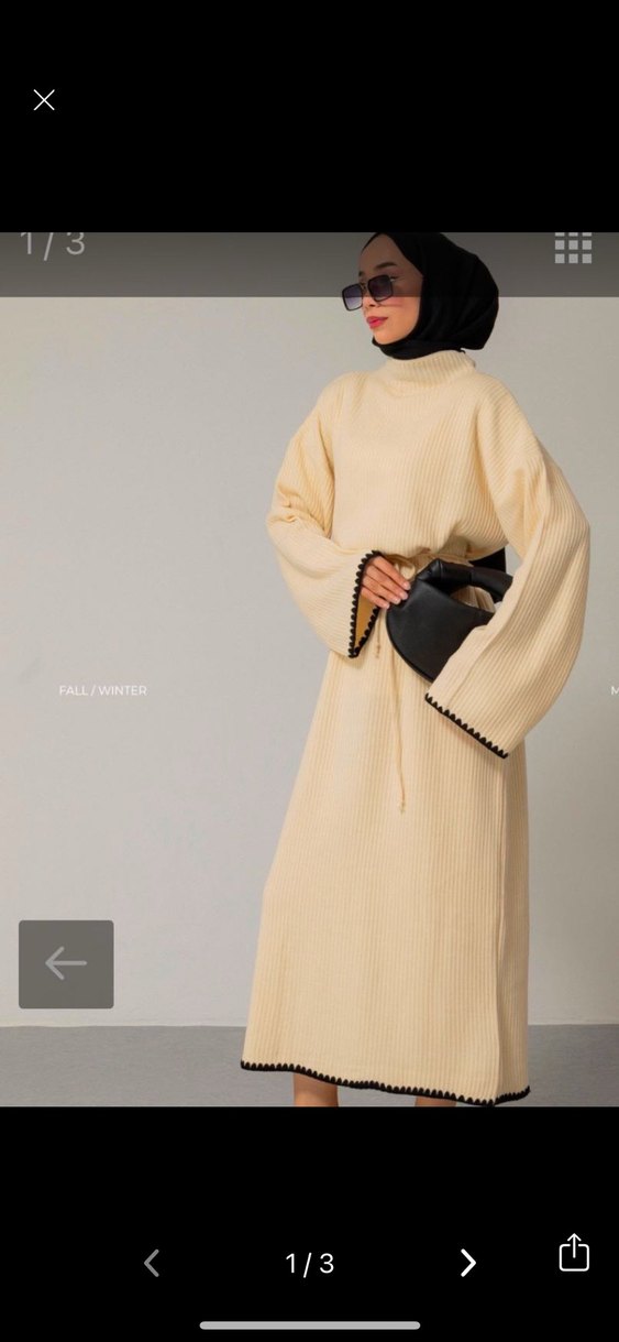 Yünlü triko kumaştan yapılmış, bol kesim, yüksek yakalı ve uzun kollu, krem camel rengi uzun elbise. Düz ve sade tasarıma, koyu renk detaylara sahip, günlük kullanıma uygun.