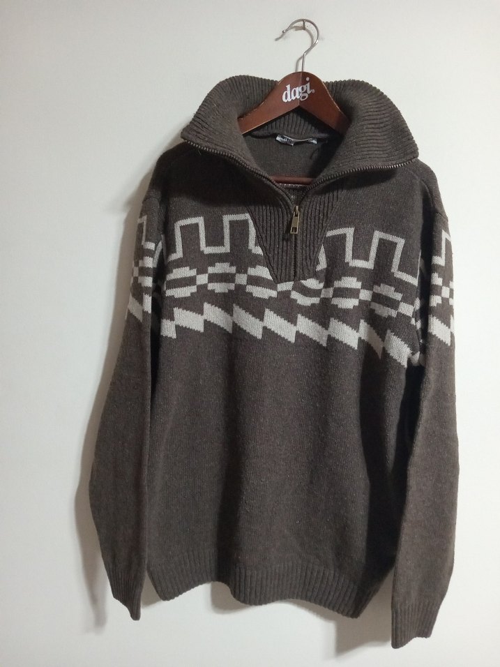Yarım fermuarlı yüksek yakalı, gri ve kahverengi tonlarda, minimalist geometrik desenli yünlü triko kazak. Rahat kesimiyle günlük sokak stiline uygun.