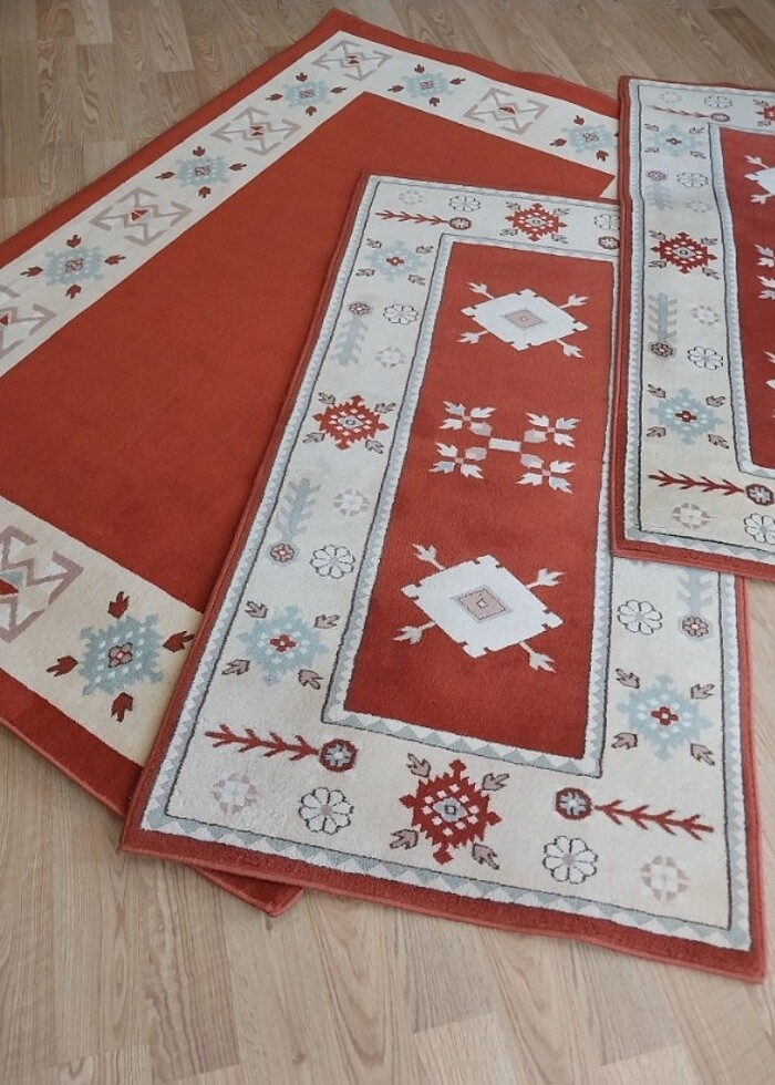 Sayılı -mevsimlik serildi, tertemiz ve yepyeni durumda.3.lü Takım fiyatıdır. Küçükler-80*150 cm Büyük- 200*125 cm. Marka çıkmadı, temsilidir. #yünser #hakiki #yün #halı #yolluk #takım
