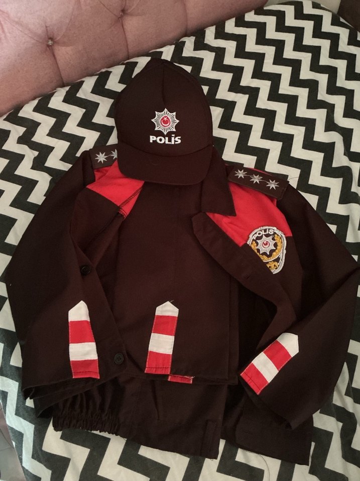 Koyu kırmızı tonlarında, baskılı polis rozetleri ve fermuarlı detaylara sahip, uzun kollu, oturan kesim çocuk polis kostümü ve şapka. (Pantolon boyu 76 cm)