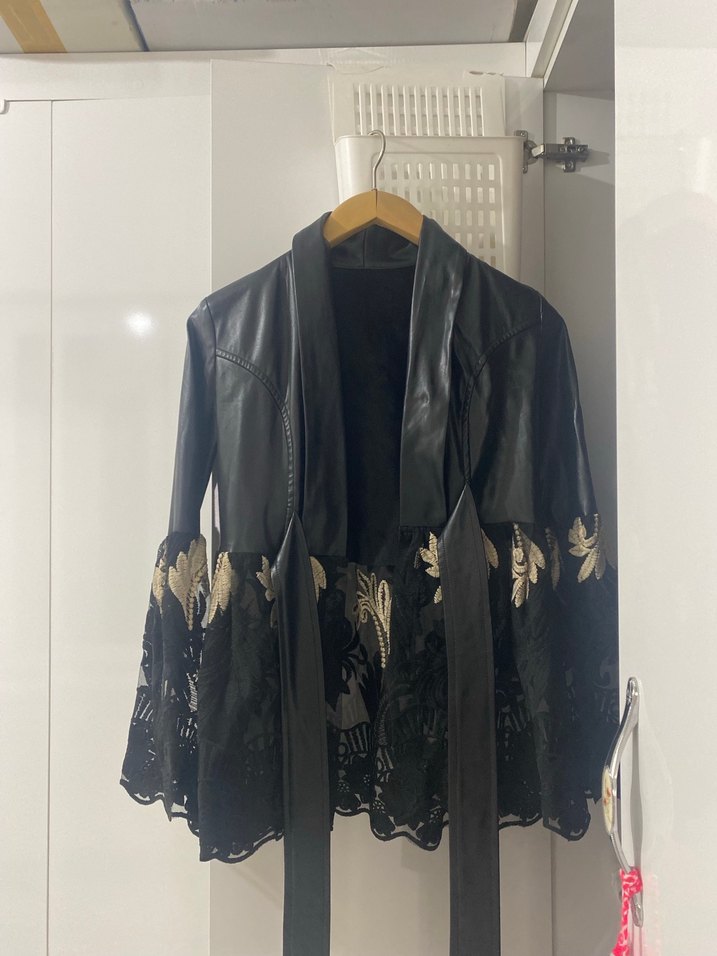 Siyah deri ceket, nakış detayları ve kemerli bel ile tasarlanmıştır. Notlu yaka, uzun kollu ve bol kesimdir, ofis için uygun gotik tarz sunar. 40-42 bedendir 1 kere kullanıldı tertemizdir