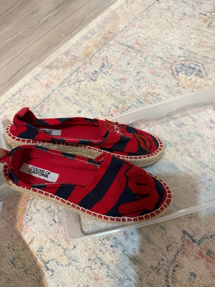 Kadınlar için kırmızı nakışlı, dolgu topuklu espadril. Velcro kapama ve kauçuk tabanlı, günlük sokak stili için uygun.