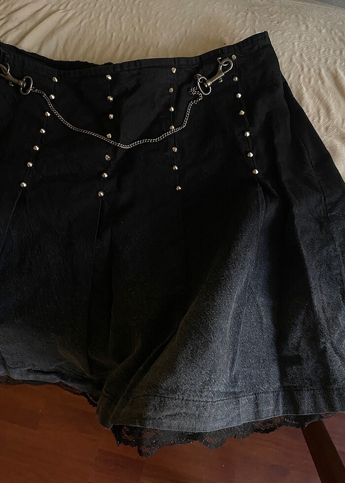 s-m beden taslanmis gorunumlu spike detay zincirli etek ucunda ufak danteller var hic giymedim cok guzel duruyo boyu da diz kapaginin az ustu #y2k #goth #vintage